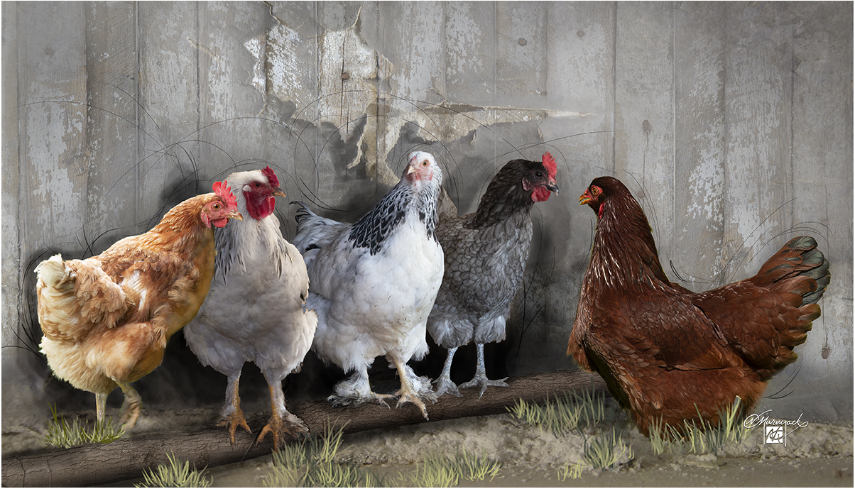 I added shadows behind the hens, on the hens and the ground by drawing them in with my pen tool, adding some blur, then painting in some more for a natural looking depth. Additional highlights and shading was drawn into the feathers accentuating the form of the hens. I had to adjust these quite a bit to make sure the hens looked like they were in the same light, and that shadows from one were cast onto the other. Remember… each hen came from a different photo, so when you are compositing a scene, the lighting most likely will be off. This is why I call my art, Altered Reality! There’s definitely a lot to alter here.