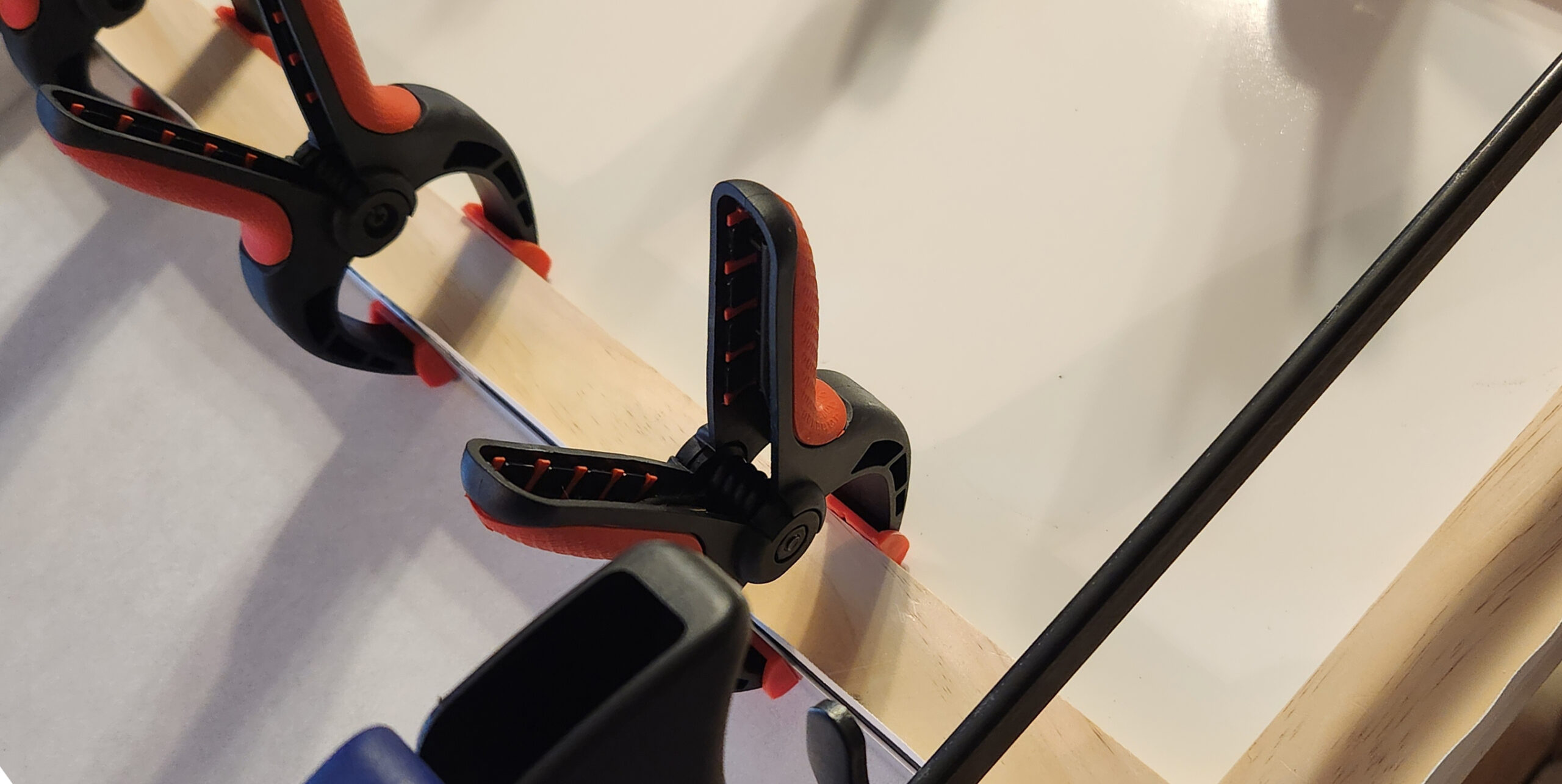 - To attach the backing board, that is cut to the exact size of the finished framing, I use E6000, then clamp it all together for another 24 hours.